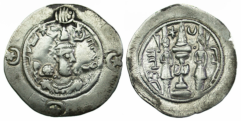 Sasanian Kingdom. Hormizd IV. A.D. 579-590. AR drachm (29.8 mm, 3.97 g, 3 h). Yazd, year 1. Crowned and cuirassed bust right, two stars above crest, three stars within crescents around / Fire altar with attendants and ribbon, star and crescent flanking flames. Göbl 202; Alram 909. VF.