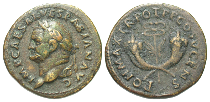 Vespasian. A.D. 69-79. Æ dupondius (27.8 mm, 12.76 g, 7 h). Antioch mint, A.D. 74. IMP CAESAR VESPASIAN AVG , laureate head left / PON•MAX•TR•POT•P•P•COS V•CENS•, winged caduceus between two crossed cornucopias. RIC 757; BMCRE 888; RPC 1983. VF.