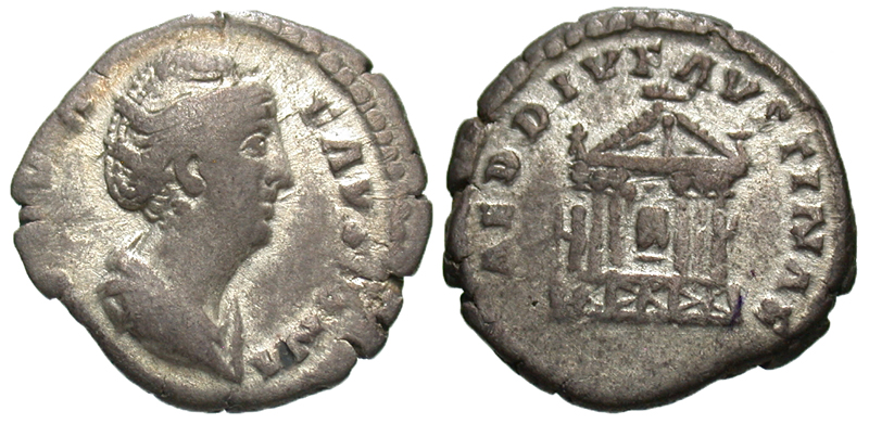 Diva Faustina I. Died A.D. 140/1. AR denarius (17.8 mm, 2.72 g, 11 h). Rome mint, A.D. 150. FAVSTINA AVGVSTA, draped bust right / AED DIV FAVSTINAE, hexastyle temple with statue of Faustina within. RIC 343; RSC 1. aVF.