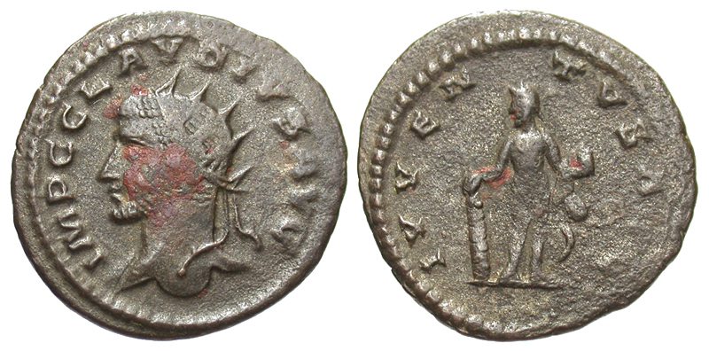 Claudius II Gothicus. A.D. 268-270. BI antoninianus (21.0 mm, 3.09 g, 5 h). Antioch mint, A.D. 268. Scarce. IMP C CLAVDIVS AVG, radiate, draped, and cuirassed bust left / IVVENTVS AVG, Hercules standing facing, holding globe and leaning on club; lion's skin draped over his arm. RIC 213; Hunter 77 var. (draped bust right; Δ in exergue); Venèra -. aVF.