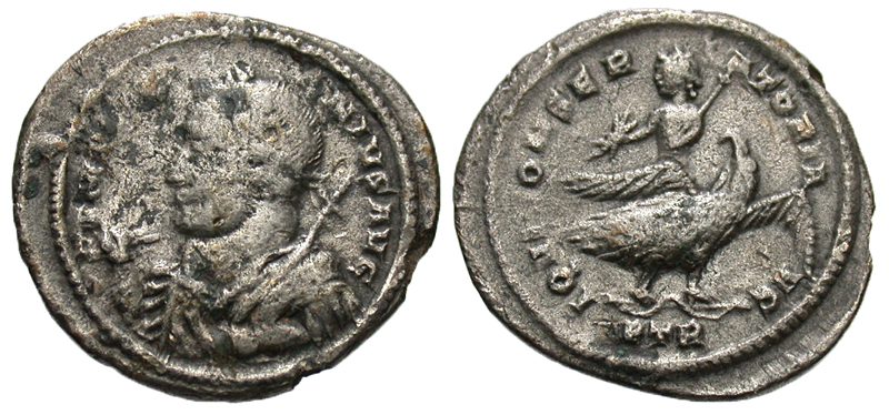 Licinius I. A.D. 308-324. AR argenteus (20.1 mm, 3.13 g, 5 h). Trier mint, A.D. 312-313. IMP LICINIVS AVG, laureate, draped, and cuirassed bust left, holding scepter and thunderbolt / IOVI CONSERVATORI AVG, Jupiter, holding scepter and thunderbolt, riding eagle right; PTR in exe. RIC 825; RSC 99. aVF, a few deposits. Scarce.