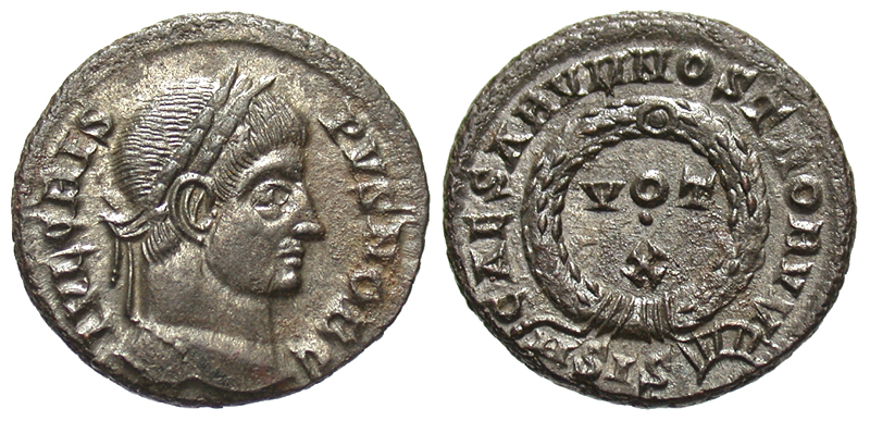Constantine II. As Caesar, A.D. 317-337. Æ 3 (19.3 mm, 3.11 g, 6 h). Siscia mint, A.D. 321-324. CONSTANTINVS IVN NOB C, laureate head right / CAESARVM NOSTRORVM around VOT X in two lines within wreath; ΓSIS sunburst in exergue. RIC 182. gVF, fully silvered.