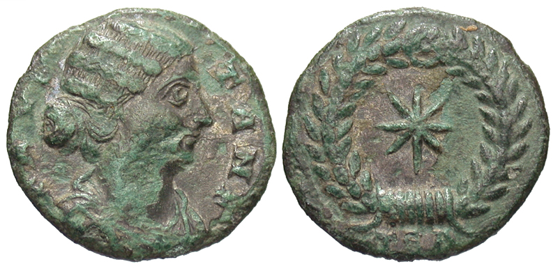 Fausta. Augusta, A.D. 324-326. Æ Follis (17.4 mm, 1.99 g, 12 h). Thessalonica mint, A.D 318-319. FAVSTA NF, draped bust right, wearing a pearl necklace / star of eight rays within laurel within wreath; TSA in exergue. RIC 49; LRBC 825. VF, green patina. Struck on a small flan.