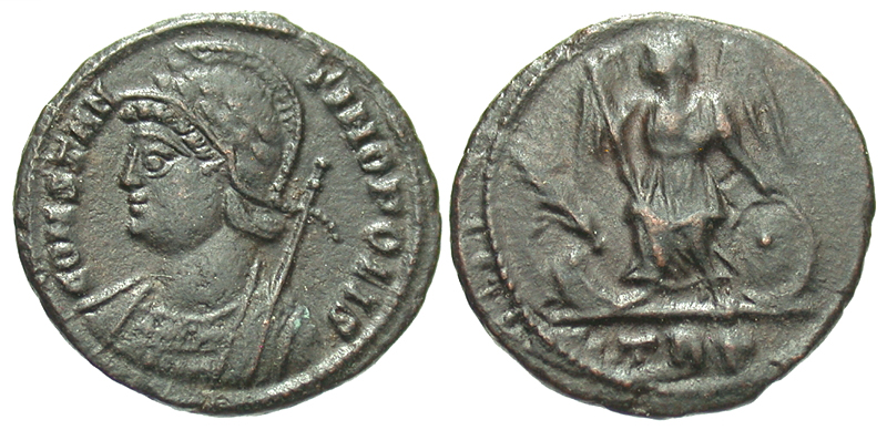 City Commemorative. A.D. 330-354. Æ 3/4 (17.9 mm, 2.46 g, 7 h). Trier mint, A.D. 330-331. CONSTANTINOPOLIS, laureate and helmeted bust of Constantinople left, wearing imperial cloak, scepter over shoulder / Victory standing left, foot on prow, holding scepter and resting hand on shield; ·TRP in exergue. RIC 523 var; LRBC 52 var. gVF.