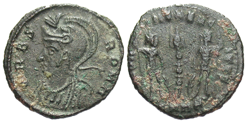 City Commemorative . A.D. 330-354. Æ 3/4 (17.2 mm, 2.11 g, 12 h). Heraclea mint, A.D. 337-340. VRBS ROMA, crested and helmeted bust of Roma left wearing imperial mantle / GLORIA EXERCITVS, two soldiers, holding spears, standing front, heads turned inward, hand on shield, one standard between them; SMHΓ in exergue. RIC 28; LRBC 941. VF, light deposits.