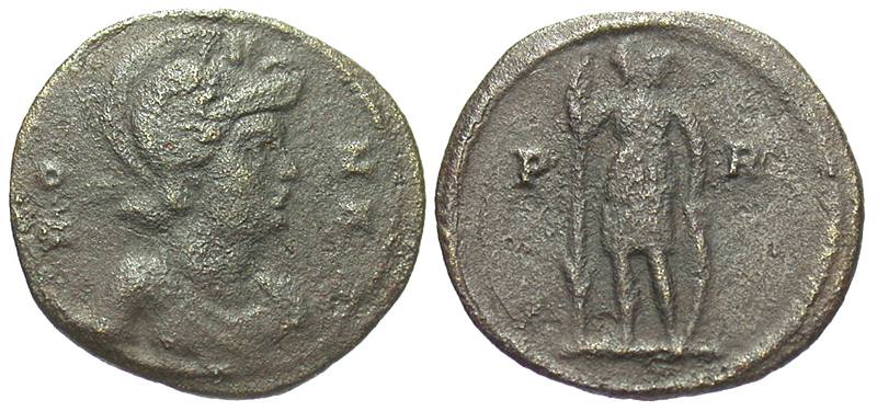 City Commemorative. A.D. 330-354. Æ 3 (16.7 mm, 1.65 g, 5 h). Rome mint, A.D. 348. Very Rare. ROMA, helmeted and draped bust of Roma right / Emperor standing facing, head left, wearing military attire, holding spear and shield; P–R across field. RIC 104; Vagi 3049. gFine.