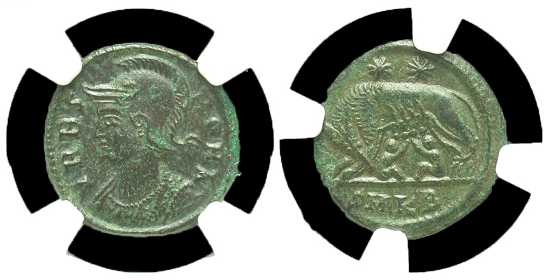 City Commemorative . A.D. 330-354. Æ 3/4 (17 mm). Cyzicus mint, A.D. 332-333. VRBS ROMA, crested and helmeted bust of Roma left wearing imperial mantle / she-wolf standing left, suckling Romulus and Remus, two stars above; SMKB in exergue. RIC 91; LRBC 1231. Ch XF.
