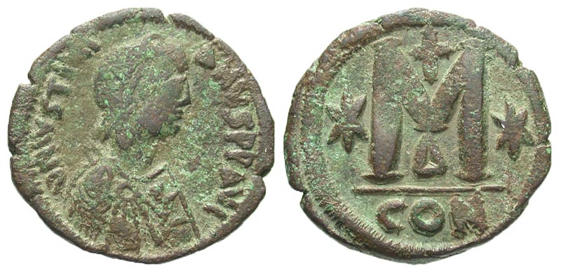 Lot 12-168. Justinian I. 527-565. Æ Follis. Constantinople mint, 527-538.