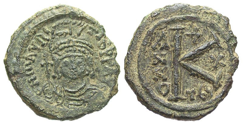 Lot 12-172. Maurice Tiberius. 582-602. Æ half follis. Thessalonica mint, year 10 = 591/592.