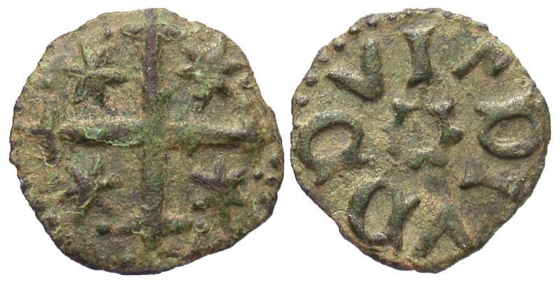 Balkans, Wallachia. Radu I. ca. A.D. 1377-1383. Æ ban (13.3 mm, 0.52 g). + Iω PDIVRD, sunburst / Cross crosslet; stars in each angle. MBR 78a. VF.