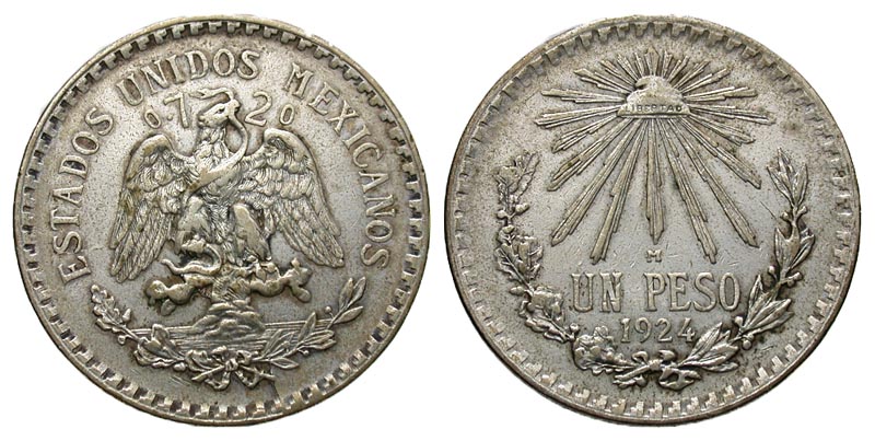 Mexico. 1924. BI 1 peso (34.1 mm, 16.59 g, 6 h). UN PESO 1924, starburst with LIBERTAD, within wreath of olive and oak leaves / ESTADOS UNIDOS MEXICANOS, eagle on a cactus with a snake in its mouth, grasping olive and oak leaves. INDEPENDENCIA Y LIBERTAD on edge. KM 455. VF.