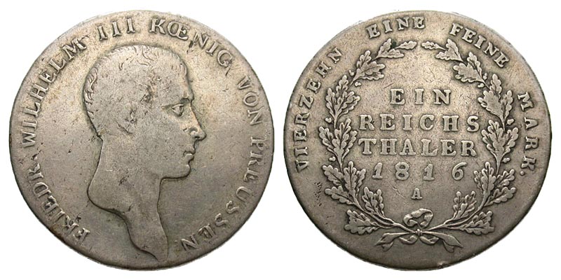 German States, Prussia. Friedrich Wilhelm III. 1797-1840. AR thaler (35.9 mm, 21.76 g, 12 h). 1816A. FRIEDR. WILHELM III KOENIG VON PREUSSEN, bare head right / VIERZEHN EINE FEINE MARK above, EIN REICHS THALER and 1816A within wreath. KM 387; Dav 756. aVF.