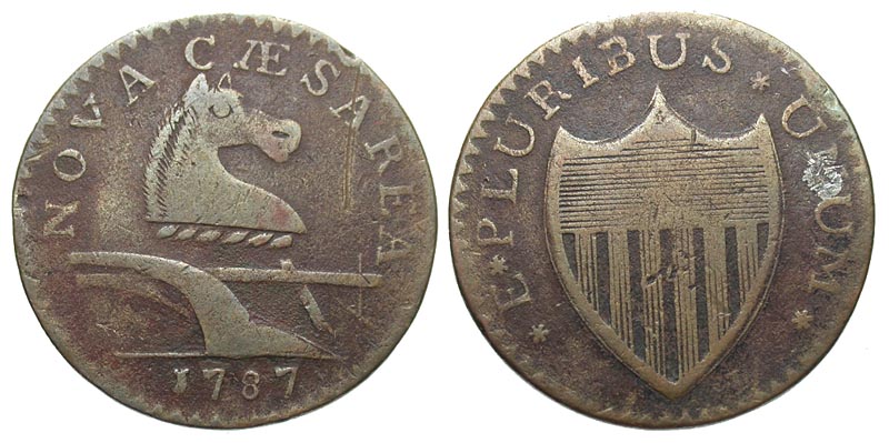 Colonial. New Jersey. 1787. CU Penny (27.9 mm, 9.68 g, 7 h). 1787. Scarce. NOVA CAESAREA, 1787, horse's head right, above plow / *E*PLURIBUS*UNUM*, shield. W 5380; Maris 64t. aVF.