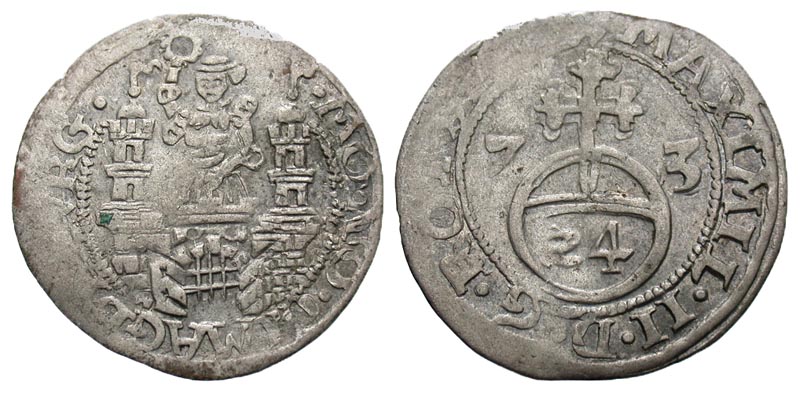 German States, Magdeburg. Civic Issue. AR 1/24 thaler (groschen) (22.3 mm, 1.83 g, 5 h). 1573. MO NO CI MAGDENVM, maiden standing between towers, above city wall / MAXIMIL II D G RO I S AV 1573, orb with cross, 1/24 within. Saurma 4135; KM 211. Toned aVF.