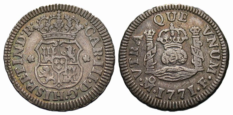 Mexico, Colonial. Carlos III. 1760-1788. AR 1/2 real (16.9 mm, 1.67 g, 12 h). Mexico City mint, 1771. CAR·IIII·D·G·HISP·ET IND·R·, crowned arms, rose on either side / VTRA QUE VNUM· o/M 1771·F·, crowned globes flanked by crowned and bannered pillars, over water. KM 68; Calico 1675.