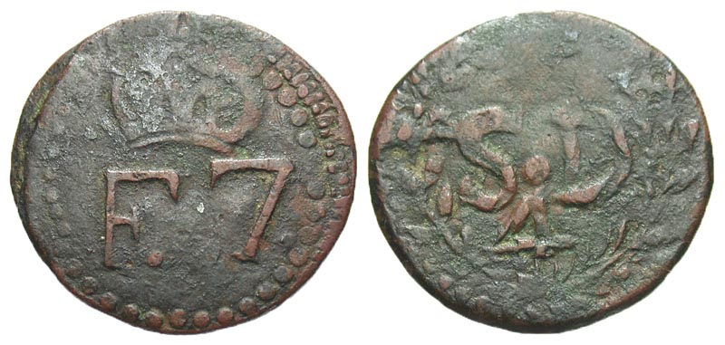 Dominican Republic, Colonial. Ferdinand VII. 1808-1821. Æ 1/4 real (24.6 mm, 5.43 g, 12 h). ND. Crown over F 7 / SD 1/4 within wreath. KM 2. Fine.