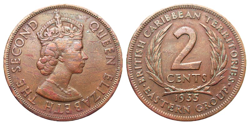 East Caribbean States. Elizabeth II. 1952-present. CU 2 cents (30.8 mm, 9.32 g, 1 h). 1955. QUEEN ELIZABETH THE SECOND, crowned bust right / BRITISH CARIBBEAN TERRITORIESĀ·EASTERN GROUPĀ·1955 2 CENTS, KM 3. VF, bag marks.