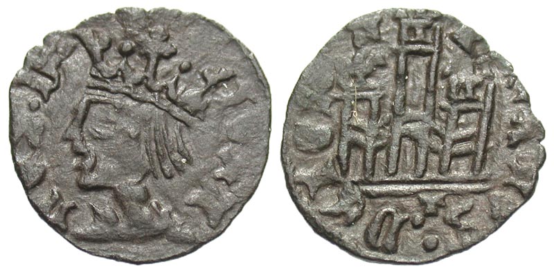 Spain, Castilla y Leon. Juan II. 1406-1454. BI coronado (16.2 mm, 0.82 g, 11 h). Toledo mint. IOHANES:DEI:GR, crowned head left / +IOHANES:DEI:GRACI, three-towered castle. AB 634. VF.