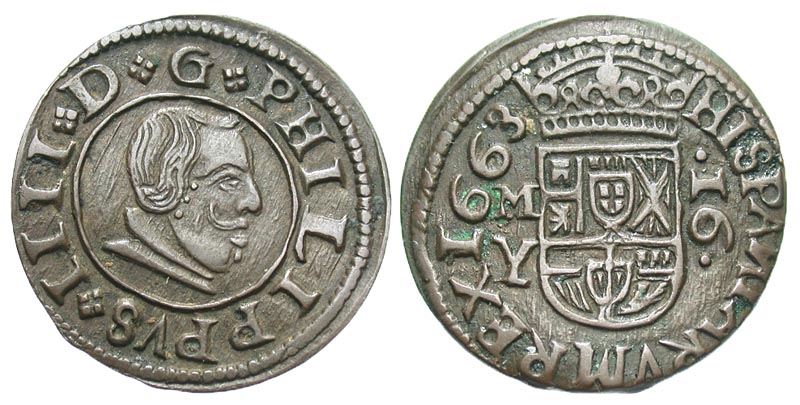 Lot 13-190. Spain, Castille y Leon. Philip IV. 1621-1665. BI 16 maravedis. Madrid mint, 1663.