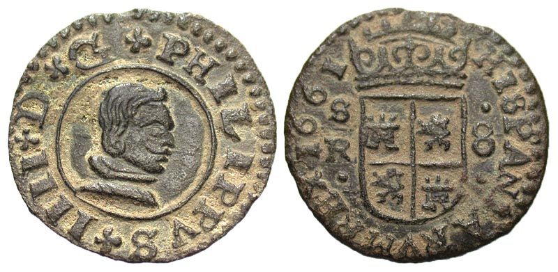 Spain, Castille y Leon. Philip IV. 1621-1665. BI 8 maravedis (20.0 mm, 1.80 g, 12 h). Segovia mint, 1661. PHILIPPVS * IIII * D* G*, bare-headed, bust right / HISPANIARVM REX 1661, crowned arms of Castille and Leon. KM 162. VF, sandy patina.