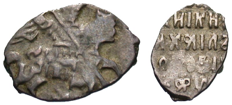 Russia, Tsars of Russia. Michael Fydorovich Romanov. 1613-1645. AR kopeck (11.8 mm, 0.41 g, 3 h). Moscow mint. Tzar, holding sword, on horseback right / four line legend. Fine.