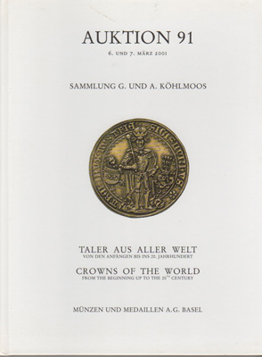 Crowns of the World: Kohlmoos Collection. — M&M Auction 91. Crowns of the World: Kohlmoos Collection. — M&M Auction 91 Basel, 6-7 March 2001, hb, 8x10, 360pp, Like new. Catalogue of an exceptional collection of World Crowns or Talers from the beginning up to the 20th Century. Fullly illustrated, with descriptions, price estimates and provenance.All books will be shipped directly from the consignor. We will invoice you with updated shipping charges shortly after the auction closes.