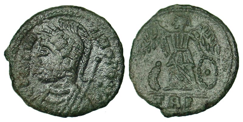 City Commemorative - Barbarous. A.D. 330-354. Æ 3/4 (14.3 mm, 1.3 g). Barbarous mint. CONSTANTINOPOLIS, laureate and helmeted bust of Constantinople left, wearing imperial cloak, scepter over shoulder / Victory standing left, foot on prow, holding scepter and resting hand on shield; TRP in exergue. VF.