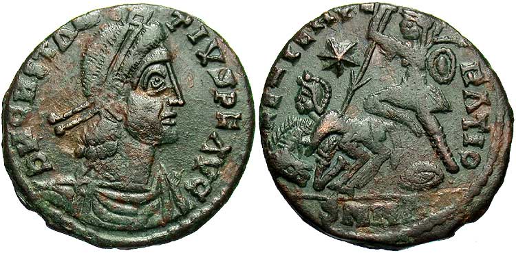 Constantius II - Barbarous imitation. c. 350-355 AD.. Billon Majorina (20 mm, 2.72 g). Diademed draped and cuirassed bust right; legend: DN CNSTAN - TIVS P F AVG / Soldier advancing left spearing fallen horseman; legend FEL TEMP R - RATIO closely approximating correct legend; in field, star, in exergue, SMNA. Prototype: RIC VIII Nicomedia 6.