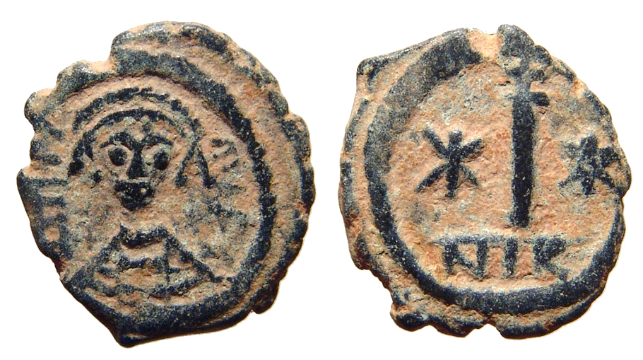 Maurice Tiberius. AD 582-602. Æ decanummium (15.5 mm, 2.97 g, 7 h). Nicomedia. His crowned and cuirassed bust facing / Large I, cross above, stars to either side, NIK in exergue. SBCV 515; DOC 117. Choice VF.