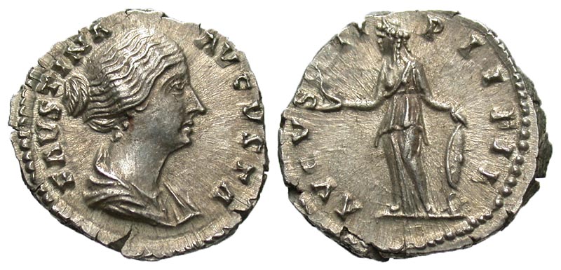 Lot 15-153. Faustina II. Augusta, A.D. 147-175. AR denarius. Rome mint, A.D. 157-161. Ex CNG eAuction 5/20/2001, lot #62695.