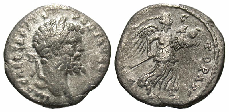 Septimius Severus. A.D. 193-211. AR denarius (18.1 mm, 2.93 g, 2 h). Emesa mint, A.D. 194. Scarce. IMP CAE L SEP SEV PERT AVG COS II, laureate head right / VICTOR AVG, Victory advancing right, holding trophy. RIC 423; RSC 696; BMCRE W393 note. Fine.