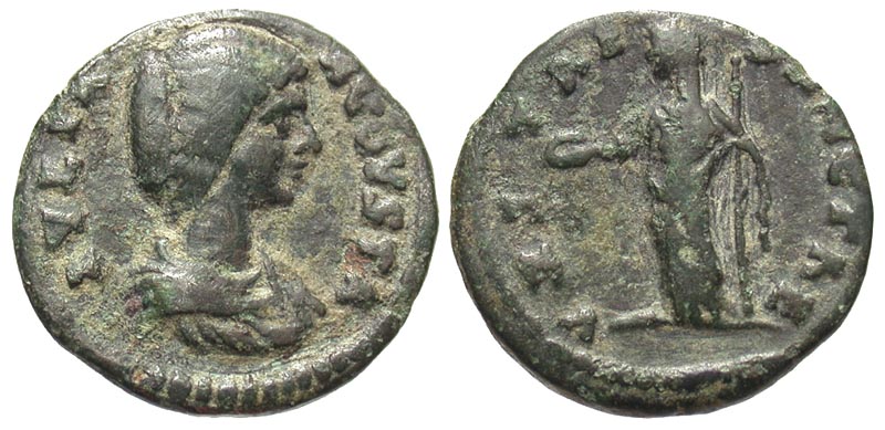 Julia Domna. Augusta, A.D. 193-217. AE "limes" denarius (17.7 mm, 2.72 g, 1 h). Illegal mint, cf. A.D. 198-202. IVLIA AVGVSTA, draped bust right / VESTAE SANCTAE, Vesta, veiled, standing left, holding patera and scepter. cf. RIC 648; cf. BMCRE 622; cf. RSC 246. VF.