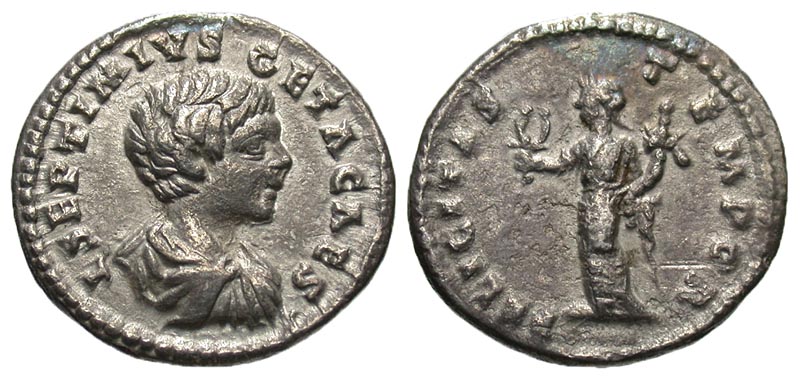 Geta. As Caesar, A.D. 198-209. AR denarius (18.5 mm, 2.62 g, 12 h). Rome mint, A.D. 198-200. L SEPTIMIVS GETA CAES , bare-headed, draped and cuirassed bust right / FELICITAS TEMPOR, Felicitas standing left, holding caduceus and cornucopia. RIC 2 (S Severus); RSC 44a; BMCRE 144 (S Severus). gVF.