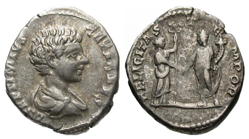 Geta. As Caesar, A.D. 198-209. AR denarius (18.9 mm, 3.35 g, 7 h). Laodicea ad Mar mint, A.D. 198-200. L SEPTIMIVS GETA CAES , bare-headed, draped and cuirassed bust right / FELICITAS TEMPOR, Felicitas standing right, holding long caduceus, clasping hands with Geta standing left, holding cornucopia. RIC 94 note; RSC 49a; BMCRE 685. VF.