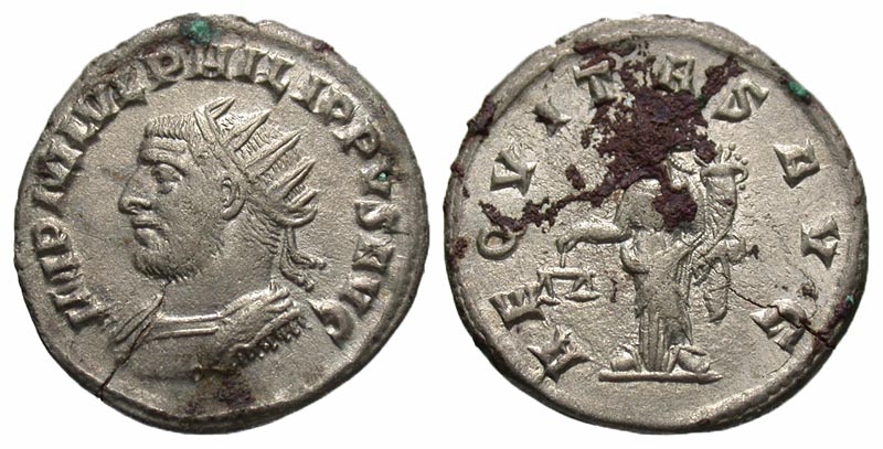 Philip I. A.D. 244-249. AR antoninianus (21.0 mm, 4.36 g, 1 h). Antioch mint, A.D. 247-249. IMP M IVL PHILIPPVS AVG, radiate cuirassed bust left / AEQVITAS AVG, Aequitas standing left, holding scales and cornucopia. RIC 82 var (AVGG); RSC 8 var (same). VF, flan crack and red corrosion adhering to reverse.