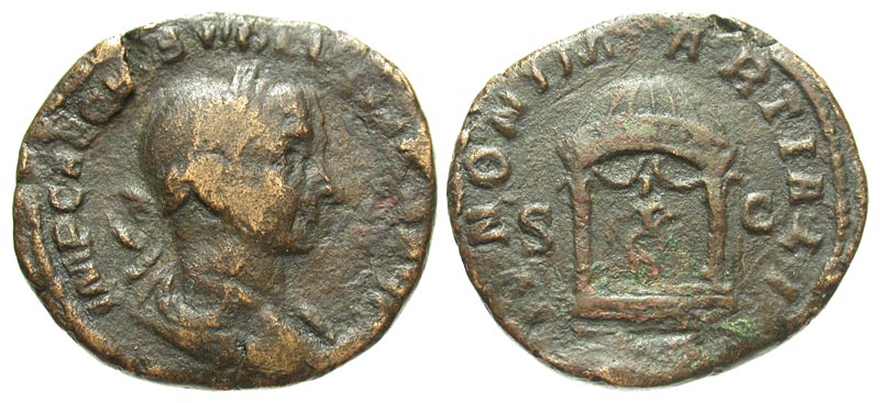 Volusian. A.D. 251-253. Æ sestertius (29.5 mm, 19.21 g, 1 h). Rome mint, A.D. 253. IMP CAE C VIB VOLVSIANO AVG, laureate, draped and cuirassed bust right / IVNONI MARTIALI, S-C, Juno seated facing, holding patera and sceptre; all within domed distyle temple, set on three-tiered base. RIC 253a. F/VF.
