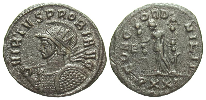 Probus. A.D. 276-282. Æ antoninianus (22.9 mm, 3.16 g, 7 h). Ticinum mint, A.D. 281. VIRTVS PROBI AVG, radiate, helmeted, and cuirassed bust left, holding shield, and spear over shoulder / CONCORD MILIT, Concordia standing faceing, holding standard in each hand, E/PXXI in exergue. RIC 481. gVF.