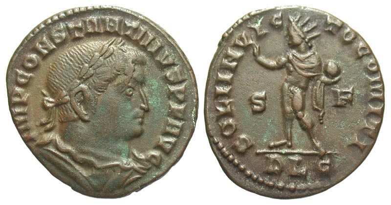 Constantine I. A.D. 307/10-337. Æ Follis (22.7 mm, 4.74 g, 7 h). Lugdunum mint, A.D. 313-314. IMP CONSTANTINVS P F AVG, laureate, draped and cuirassed bust right / SOLI INVICTO COMITI, Sol standing left, holding globe and raising right hand; S-F across fields, PLG in exergue. RIC 5. VF.