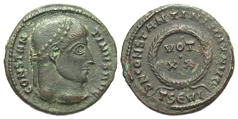 Constantine I. A.D. 307/10-337. Æ 3 (18.9 mm, 3.33 g, 6 h). Thessalonica mint, A.D. 320-324. CONSTANTINVS AVG, laureate head right / D N CONSTANTINI MAX AVG, legend around VOT/XX; TSЄVI in exe. RIC 101/123. VF.