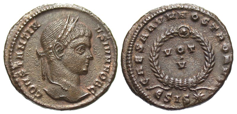 Constantine II. As Caesar, A.D. 317-337. Æ 3 (19.4 mm, 3.43 g, 6 h). Siscia mint, A.D. 320-321. CONSTANTINVS IVN NOB C, laureate head right / CAESARVM NOSTRORVM around VOT V in two lines within wreath; ЄSIS* in exe. RIC 163. VF.