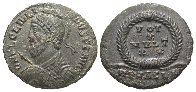 Julian II. A.D. 360-363. Æ 3 (20.0 mm, 3.02 g, 12 h). Heraclea mint. D N FL CL IVLIANVS PF AVG, helmeted and cuirassed bust left, holding spear and shield / VOT X MVLT XX, legend in four lines within wreath; HERACL·A in exe. RIC 106; LRBC 1909. aVF.