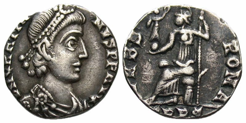 Gratian. A.D. 367-383. AR siliqua (15.6 mm, 1.20 g, 12 h). Trier mint, A.D. 367-375. D N GRATIANVS P F AVG, pearl-diademed, draped, and cuirassed bust right / VRBS ROMA, Roma seated left on throne, holding Victory on globe and scepter; TRPS in exergue. RIC 27f; RSC 86b. gVF, toned and clipped.