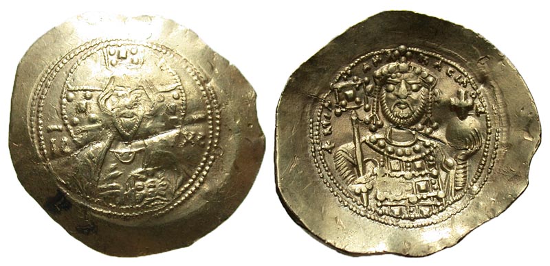 Michael VII Ducas. 1071-1078. AV Histamenon Nomisma (28.5 mm, 4.25 g, 6 h). Constantinople mint. IC-XC, nimbate bust of Christ facing, right hand raised in benediction, holding book of gospels in left hand / MIXAHΛ RACIΛ O Δ, bearded bust of Michael VII facing, wearing crown and loros, holding labarum and globus cruciger. SBV 1868; DOC 2a. VF.