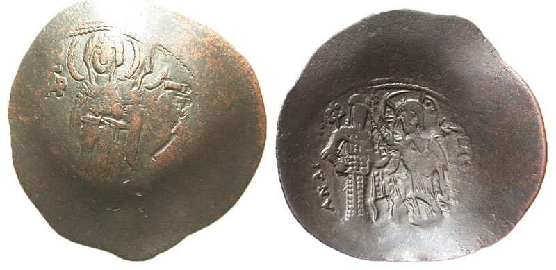 Andronicus I Comnenus. 1183-1185. BI aspron trachy (29.7 mm, 2.56 g, 5 h). Constantinople mint. MHP-ӨV, standing facing, wearing nimbus crown, pallium, and maphorium, and holding head of infant Christ facing, wearing nimbus crown / ANΔPONIKO C ΔЄCΠOTHC; IC-XC, Andronicus standing facing, wearing divitision, loros, and sagion, holding labarum and globus cruciger, and being crowned by Christ standing facing, wearing pallium and colobium and holding Gospel book. SBV 1985; DOC type 3b. VF.