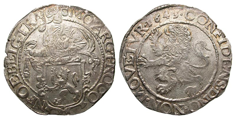 Low Countries, Gelderland. AR lion daalder (42.3 mm, 26.74 g, 1 h). 1643. MO ARG PROCO NFOE BELG TRA, armored bust of William the Silent left, above crest with lion rampant left / 1643 CONFIDENS DNO NON MOVETVR, Lion rampant left. KM 15.2; Davenport 4849. aVF, clipped.