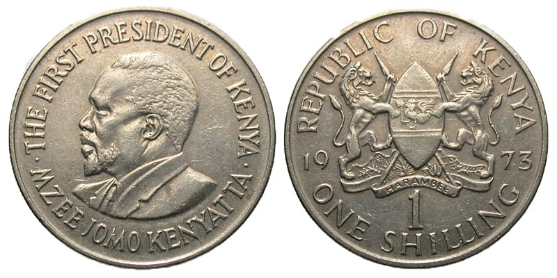 Kenya. AR 1 shilling (27.7 mm, 7.84 g, 12 h). 1973. THE FIRST PRESIDENT OF KENYA, MZBE JOMO KENYATTA, bust left / REPUBLIC OF KENYA, 1973, ONE SHILLING, coat of arms. KM 14. aUnc.