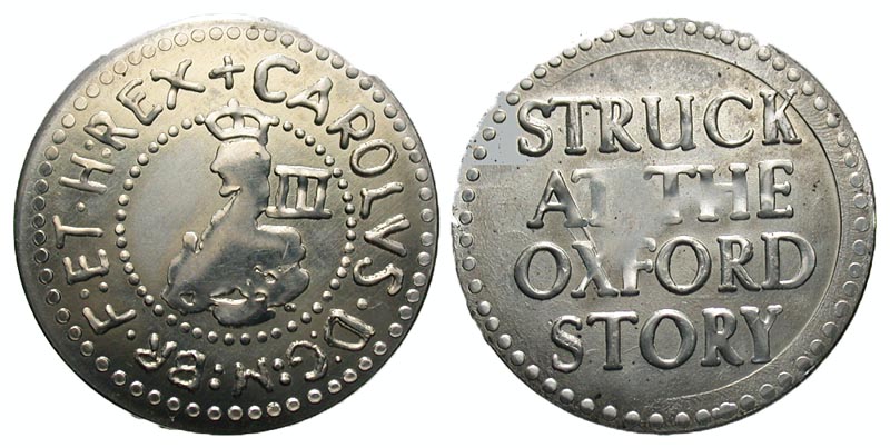 England. AL three pence (23.2 mm, 3.02 g, 11 h). CAROLVS D G M BR F ET H REX, crowned bust left, III behind / STRUCK AT THE OXFORD STORY, aUnc.