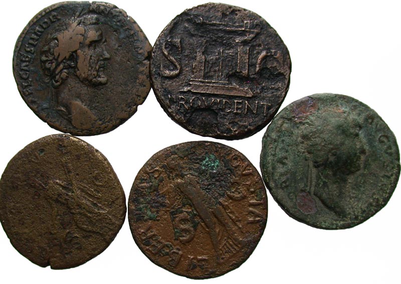 Lot of 5 early Roman Bronze Coins #1. Different emperors and types.