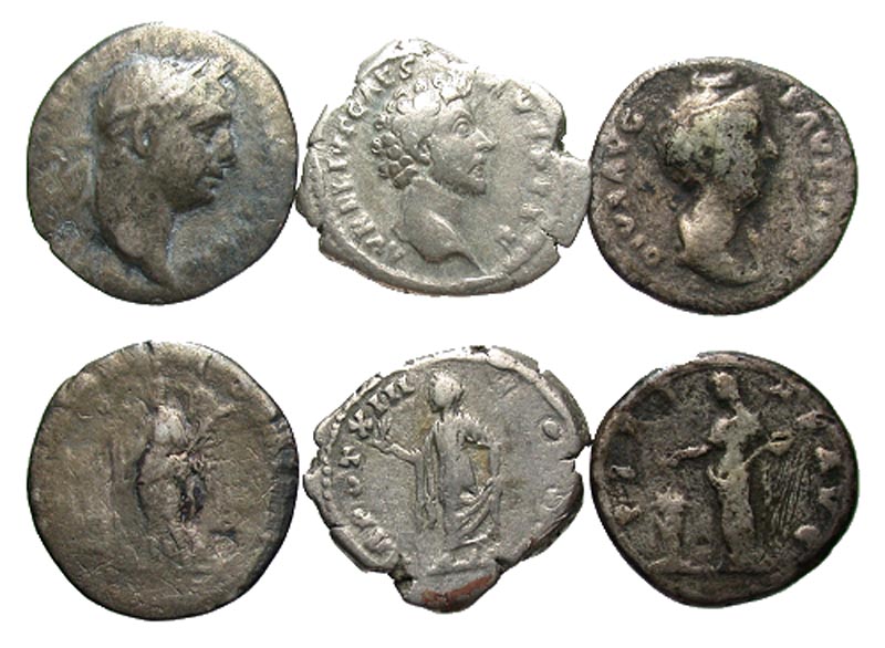 Lot of 3 Denarii, Antonine era. Marcus Aurelius, Faustina II, and Trajan. All low grade.