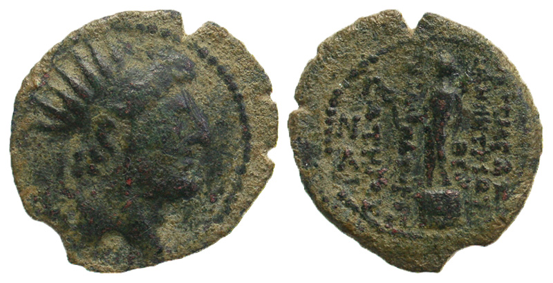 Seleukid Kingdom. Demetrios III Eukairos. 97/6-88/7 B.C. Æ 20 (20.5 mm, 3.39 g, 11 h). Damascus. Diademed and radiate head right / BAΣIΛEΩΣ ΔHMHTPIOY ΘEOY ΦIΛOΠATOPOΣ CΩTHPOC, Hermes standing left on pedestal, holding palm and kerykeion; N over A in left field. SC 2456(4); SNG Spaer 2876. aVF.